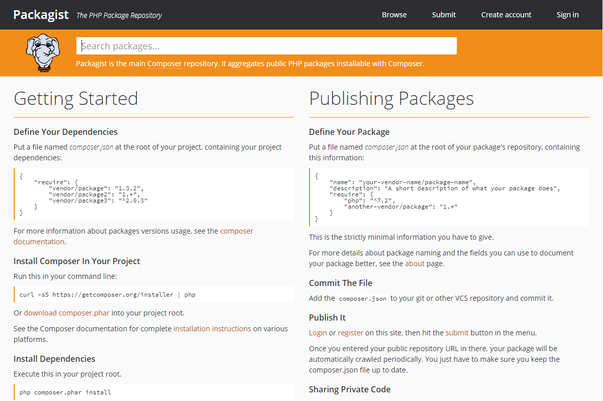 Packagistのサイト( https://packagist.org/ ) にアクセスします。