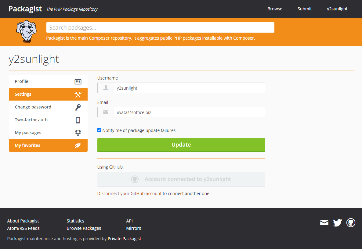 ここで、Packagistで登録しているメールアドレスをGravatarにも登録して、そのメールにアバター画像を紐付けすれば、Packagistの プロフィールのアバターが変更できます。
