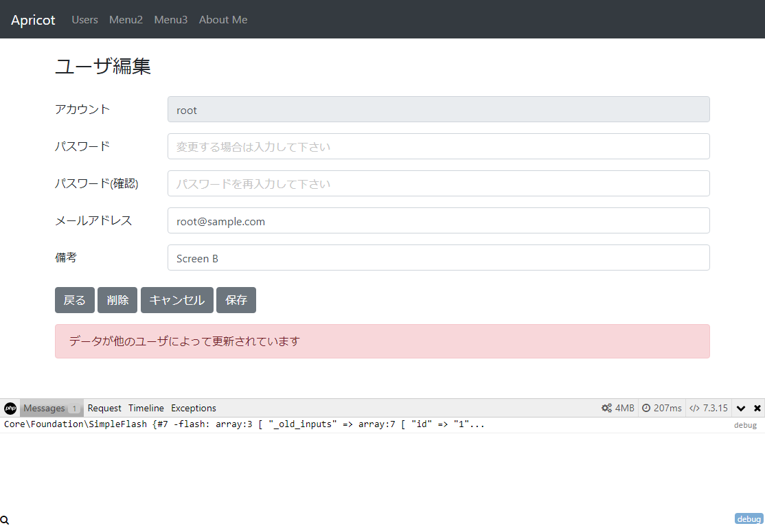 ■ 画面表示時点のデータが変更されているので楽観的ロック例外が発生します。