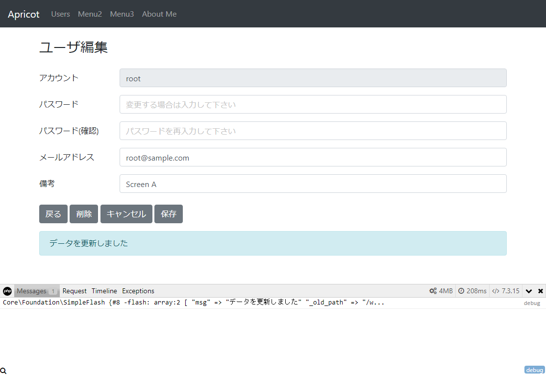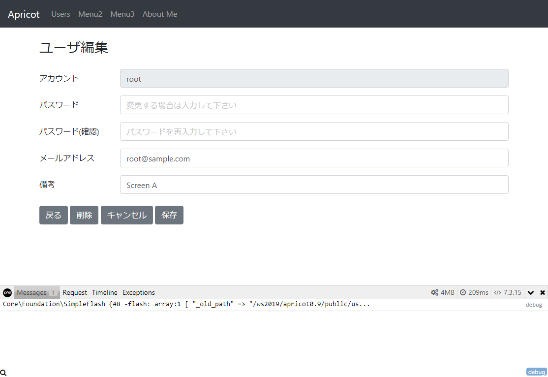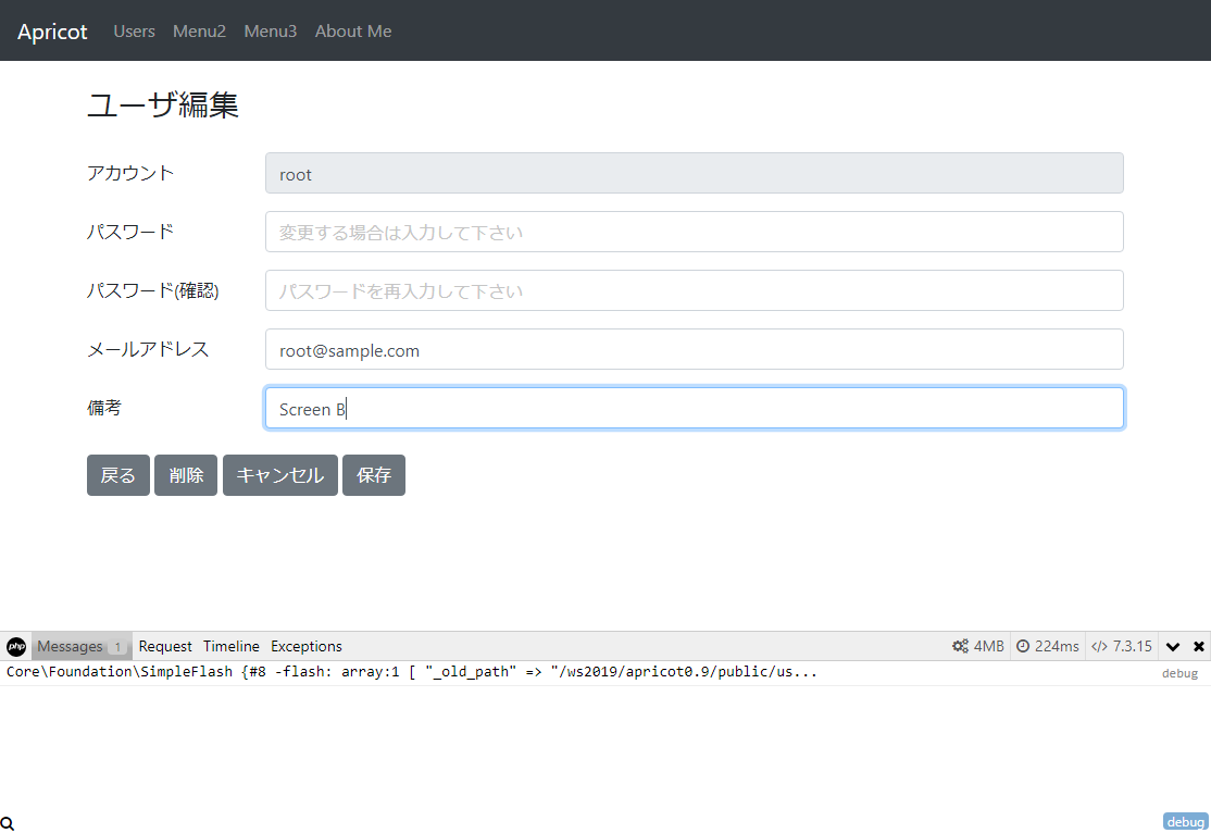 前もって 画面A,B共にrootユーザの編集画面を表示しておきます。
