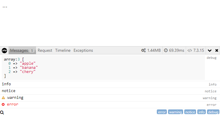 - messages — デバッグ出力(debug/info/notice/warning/errorメソッドで出力した値)