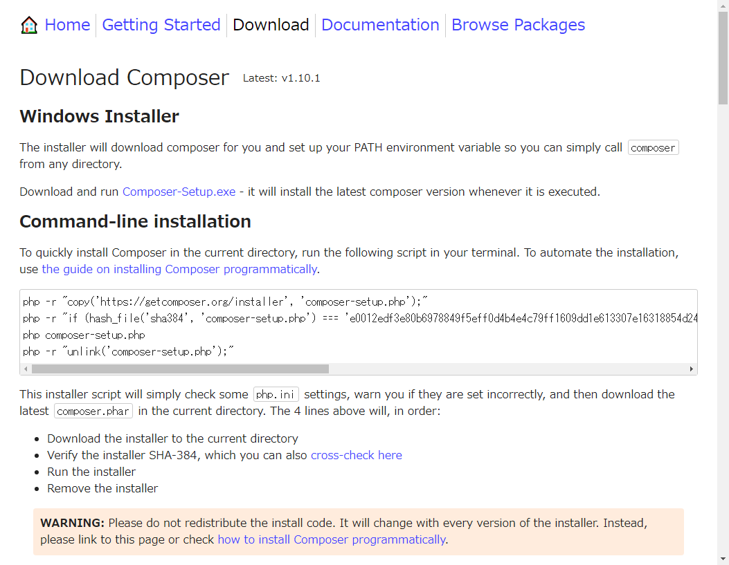 上のインストールスクリプト(composer-local-installer.bat)はインストーラ(composer-setup.php)毎に違うので、このまま実行しないで下さい。必ず、最新のスクリプトを取得してから実行して下さい。composerのインストールが終了したら、以下のコマンドでComposerのバージョンを確認して下さい。