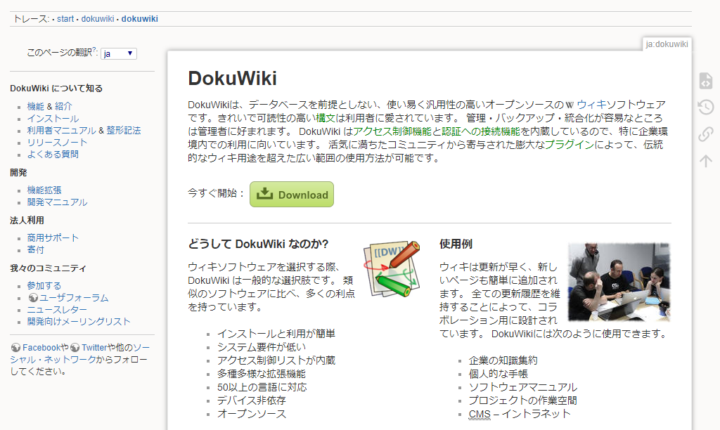 DokuWiki 2018-04-22b “Greebo”まず、DokuWiki の日本語公式サイトにアクセスします。