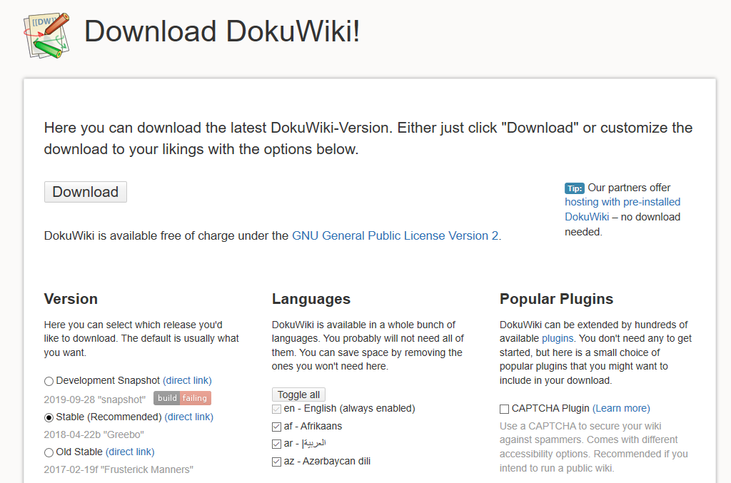 欧米ではDokuWikiは最もポピュラーなWikiで、2017年11月、Google Cloud のCloud Launcher で |高い人気を誇る21のオープンソース製品の1つにも選ばれました。他には、Apache Solr、WordPress、Jenkins、Mysql、Nginx、Node.js、Redmine、Tomcatなどが選ばれている事を考えれば、いかに評価が高いかがうかがわれます。