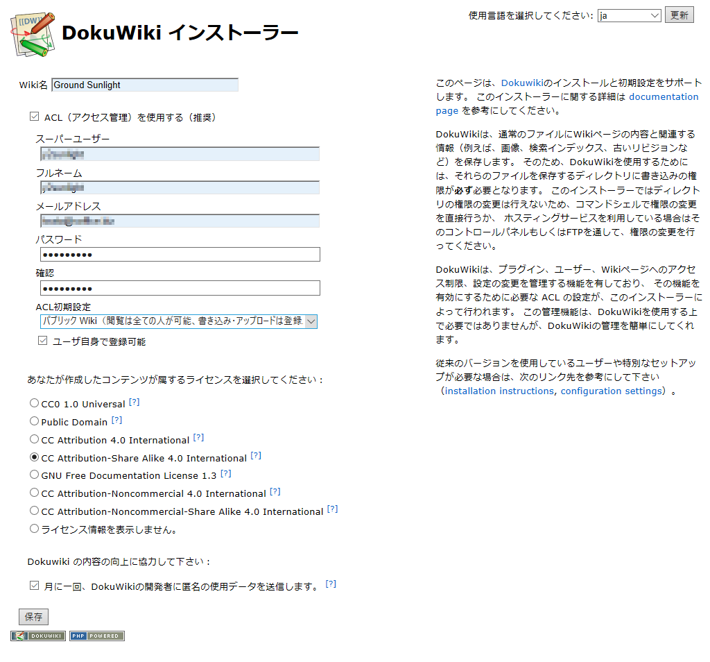 項目 設定例 Wiki名 例) Ground Sunlight ACL(アクセス管理)を使用する ONに設定します(推奨) スーパーユーザー 例) y2sunlight フルネーム 例) ワイツ サンライト メールアドレス 例) y2sunlight@example.com ACL初期設定 本サイトのようにしたければ、[パブリックWiki]を選択する ライセンス1) 例) CC Attribution-Share Alike 4.0 International その他は適宜入力して下さい。