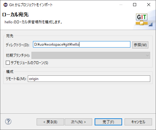 D:\\usr\workspace\gitを使用し、以下のフォルダをプロジェクトフォルダに指定します。D:\\usr\workspace\git\hello