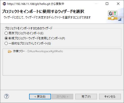 ■ [新規プロジェクト・ウイザードを使用してインポート]を選択して、[完了]を押します。