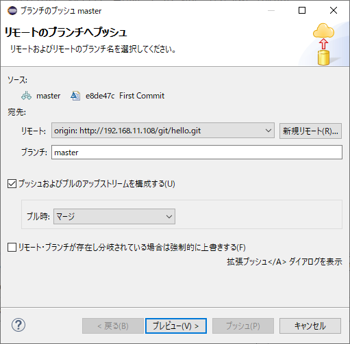EGitでプッシュする方法はいろいろありますが、ここでは、Gitコマンドと同じ流れで