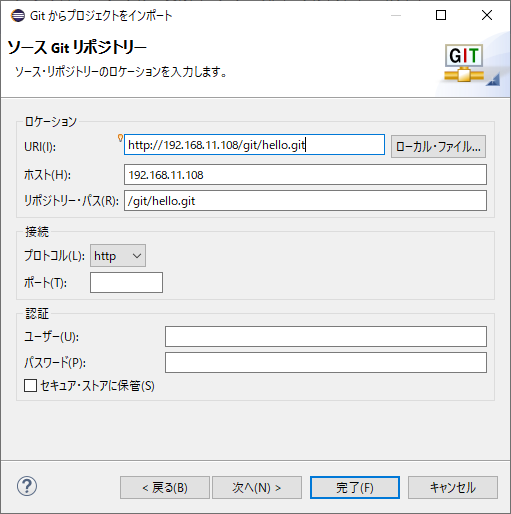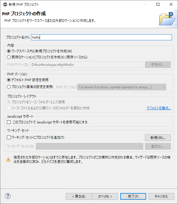 helloを入力して、[完了]を押します。helloフォルダは既にローカルリポジトリして作成されているので「指定された外部ロケーションは既に存在します」のメッセージが出ますが問題ありません。