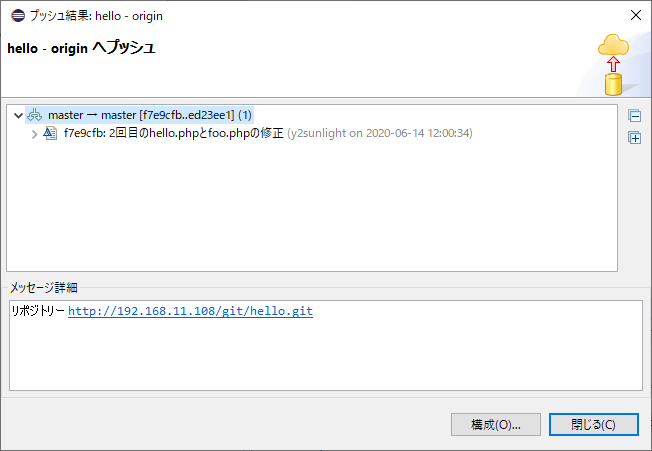 ■ [コミット]ボタンを押すとローカルリポジトリにコミットされます。■ 簡単な修正の場合は、コミットとプッシュを一度にすることもできます。この場合は [コミットおよびプッシュ]ボタンを押して下さい。ローカルリポジトリにコミットされた後、リモートリポジトリにプッシュされ、プッシュ結果の画面が表示されます。
