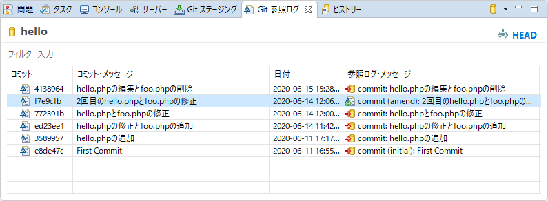 同様の操作はプロジェクトの[ヒストリー]からもできます。プロジェクトの[ヒストリー]を表示するには、[プロジェクト・エクスプローラー]からプロジェクトを右クリックして[チーム][ヒストリーに表示]を選択して下さい。下図は [Git参照ログ] の例です。ここでは、最新のコミットを取消してもう1つ前のコミットまで戻す操作を行ってみます。
