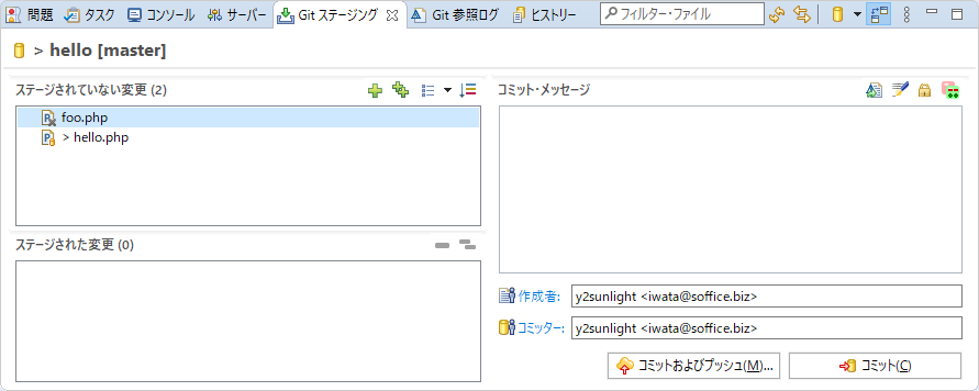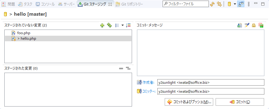EGitでは、ステージング用に [Gitステージング]用のビュー が用意されています。