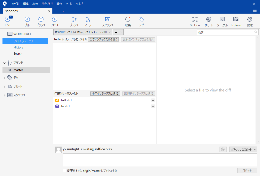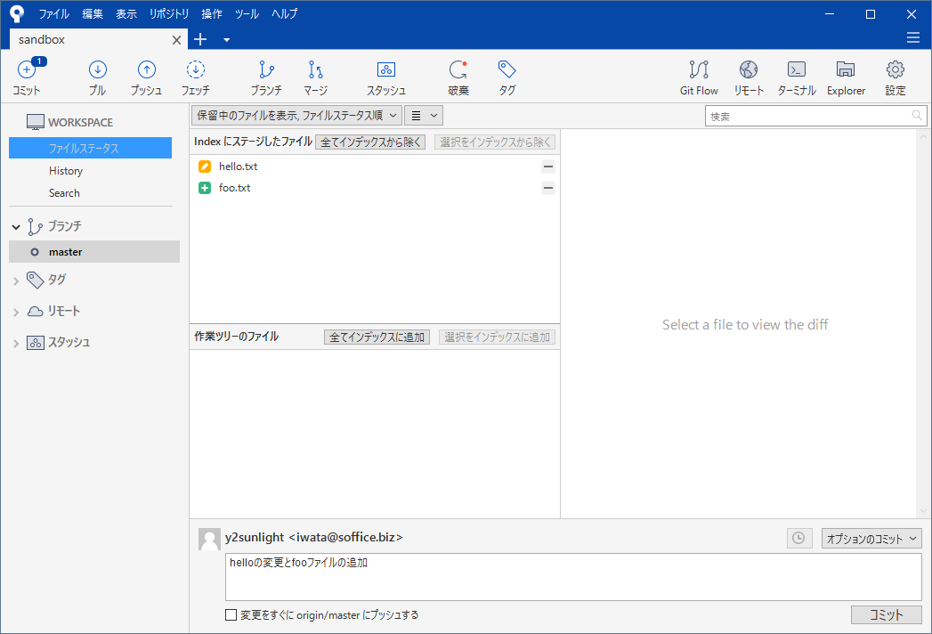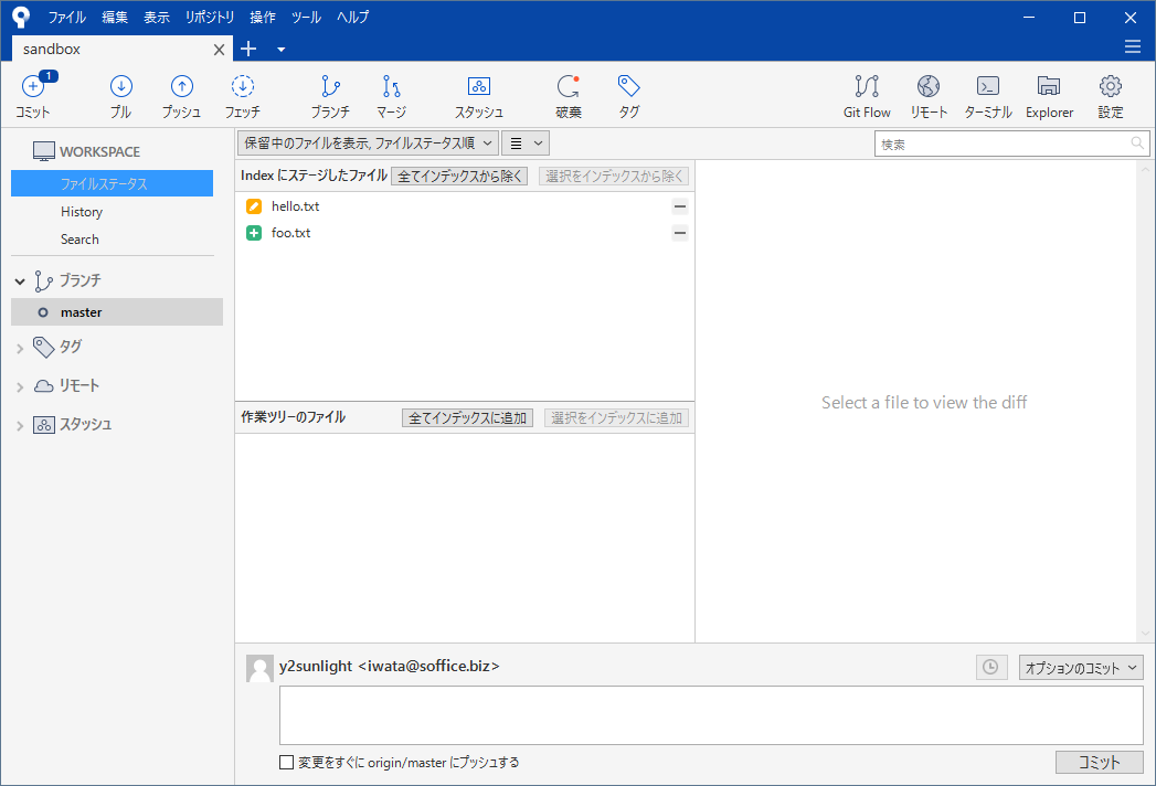左上ペインの[ファイルステータス]をクリックして下さい。インデックスに追加されいるファイルは[Indexにステージしたファイル]に現れます。
