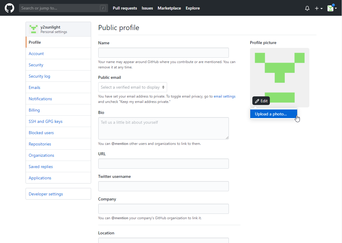 ■ 左側の[Profile picture]の[Edit]ボタンを押し、[Upload a photo…]を選択して下さい。