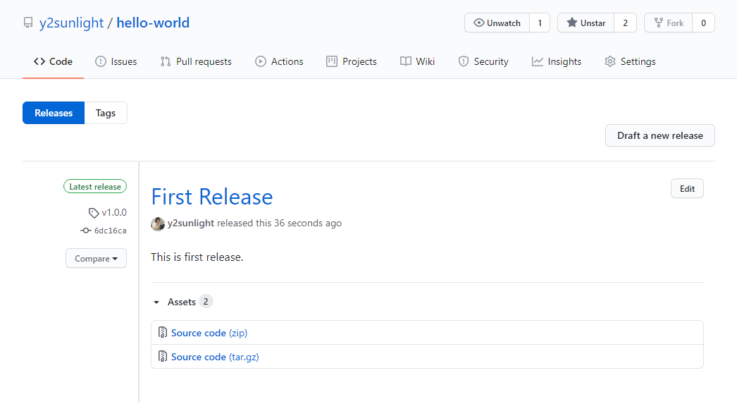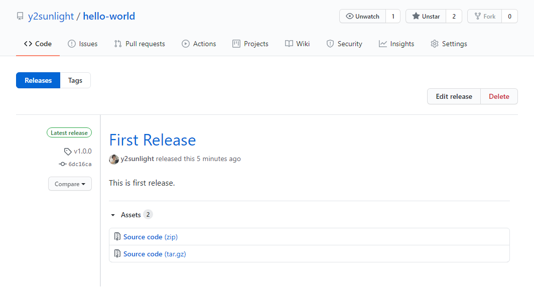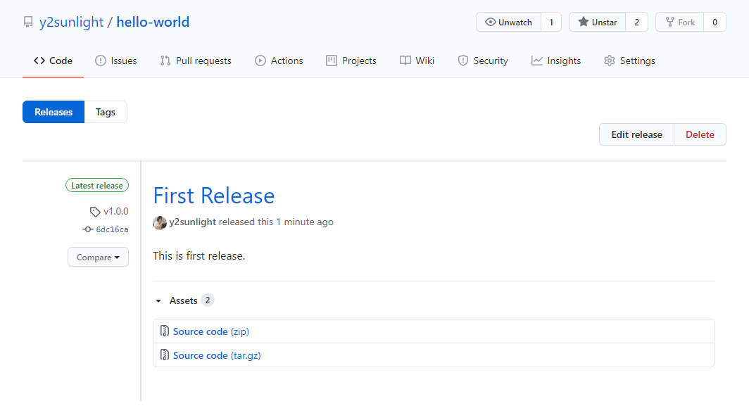 リリースの編集リポジトリ hello-world のメインページに移動します。  ■ 右サイドの[Releases]をクリックします。  ■ リリースの一覧が表示されます。