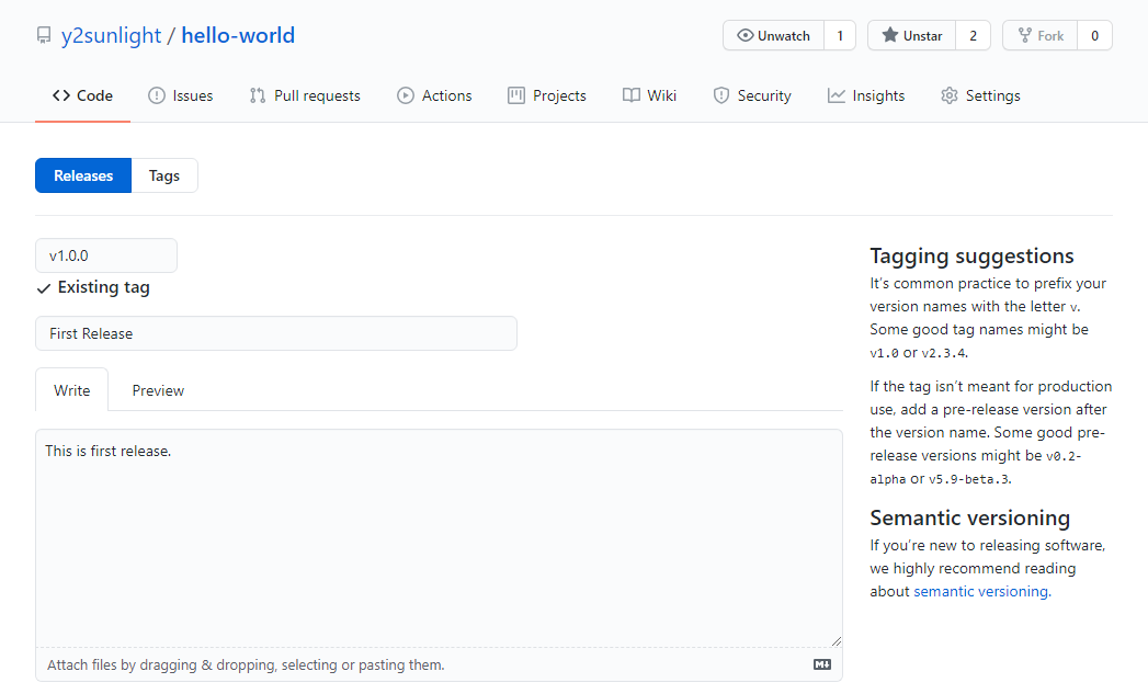 リリースリリースの作成リポジトリ hello-world に移動します。まだ表示していない場合は、ダッシュボードの左サイドバーから hello-world を選択して下さい。  ■ 右サイドの [Releases] 下の [Create a new release] をクリックします。  ■ [Tag version]を入力します( ここでは先に作成してプッシュした v1.0.0)。ここで新しいTag versionを入力すると、新しいタグが生成されます。リリース用のタグは、筆者的には、GitクライアントではなくGitHub(この画面)で作成する方が良いように思います。本章では、Eclipseでの操作も紹介する為に、Eclipseでタグを作成しています。■ [Release title]を入力します。