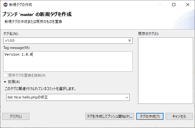 Eclipseでのタグの作成Eclipseの[プロジェクト・エクスプローラー]でプロジェクト(hello-world)を右クリックし、[チーム][拡張][タグの作成…]を選択して下さい。  ■ [タグ名]を入力します。 ここではセマンティック バージョニングに準じたバージョン番号を入力しています。■ [Tag Message]を入力します。