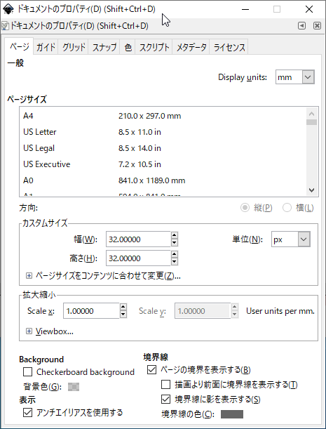 Inkscapeメニュー[ファイル][ドキュメントのプロパティ]を開きます。