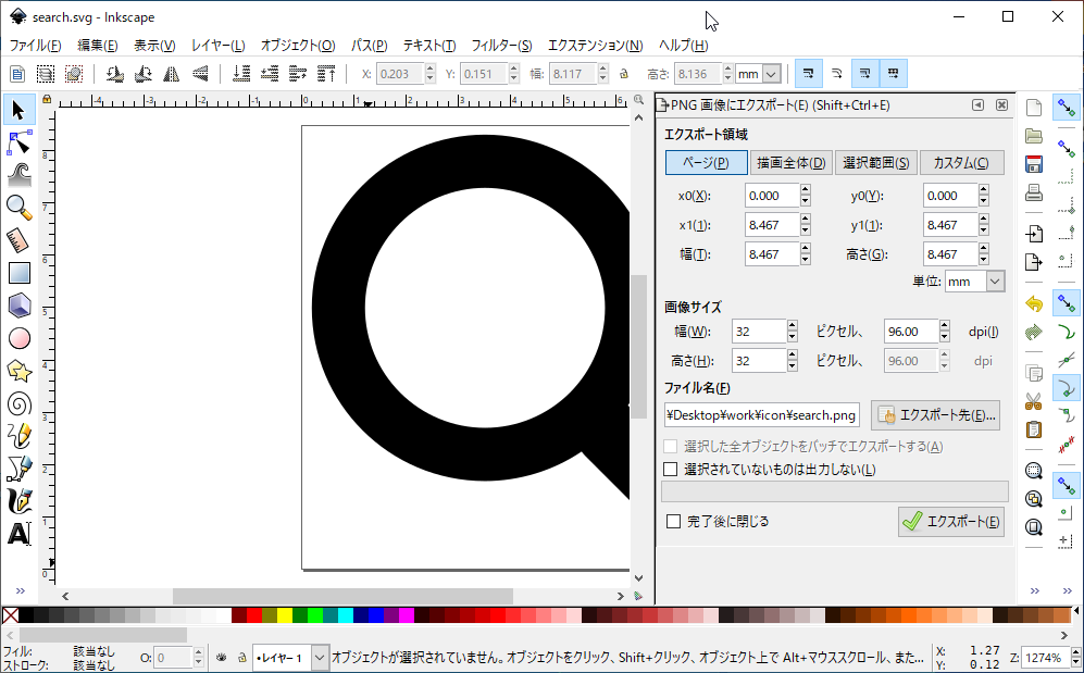 Inkscapeメニュー[ファイル][PNG画像にエクスポート]をクリックします。