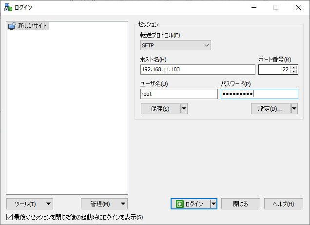 ■ ホスト名、ユーザ名、パスワードを入力し、[保存]を押します。
