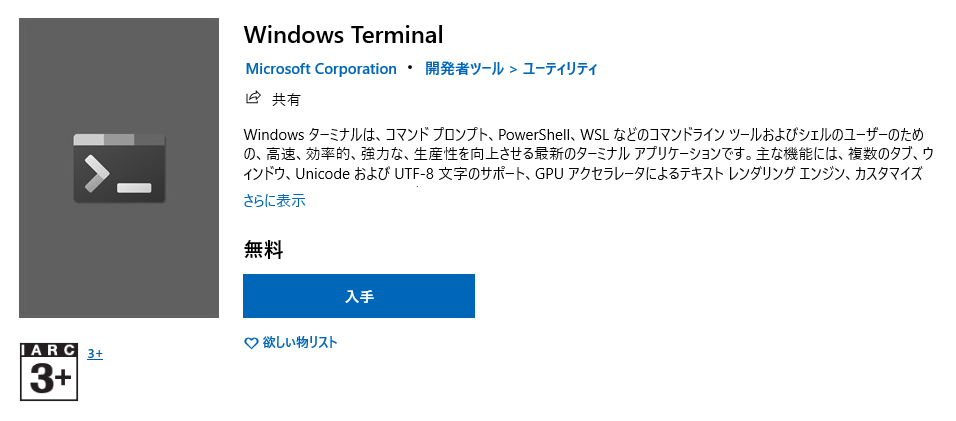 Windows ターミナルは、コマンドプロンプト、PowerShell、WSL上のシェルなどの複数のコマンドラインツールを1つに統合した最新のターミナル アプリケーションです。WSLの導入と同時に是非ともインストールしておきたい開発用ツールです。