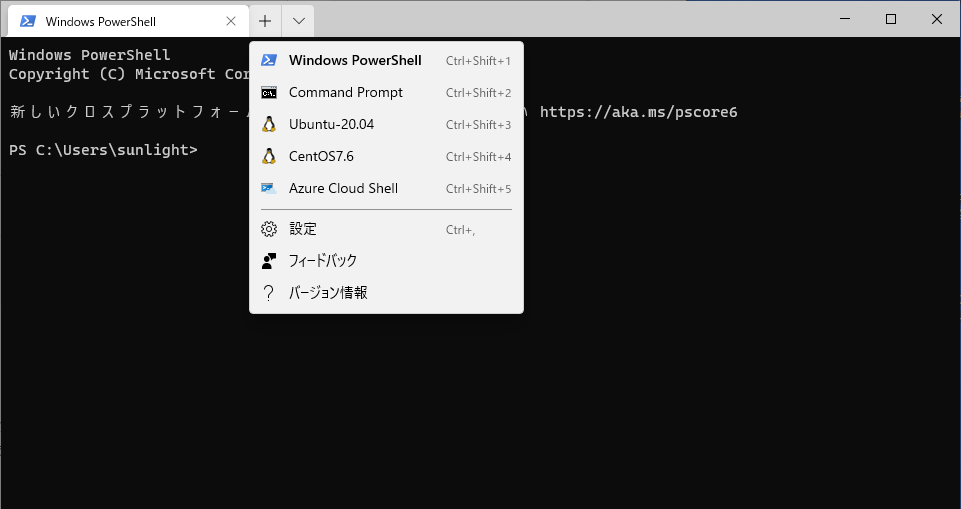 タイトルバーのドロップダウンメニューを開くとインストールされているターミナル一覧が表示されます。
