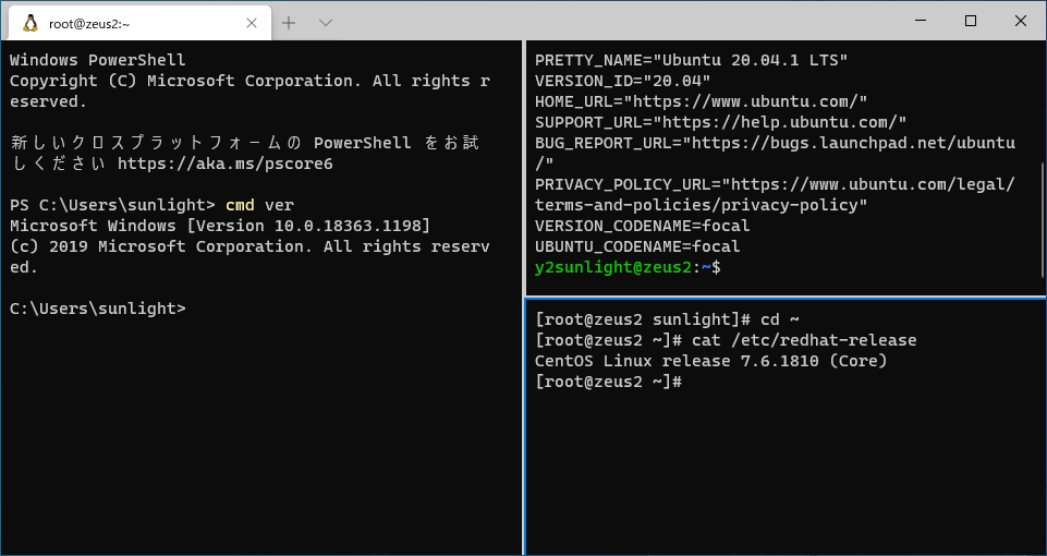 タブに新しいターミナルを開くことは勿論、以下のようにタブを複数のペインに分割することも出来ます。