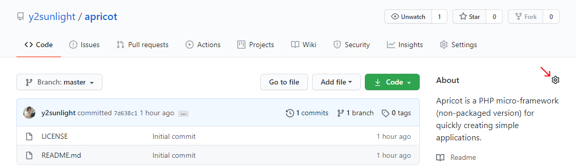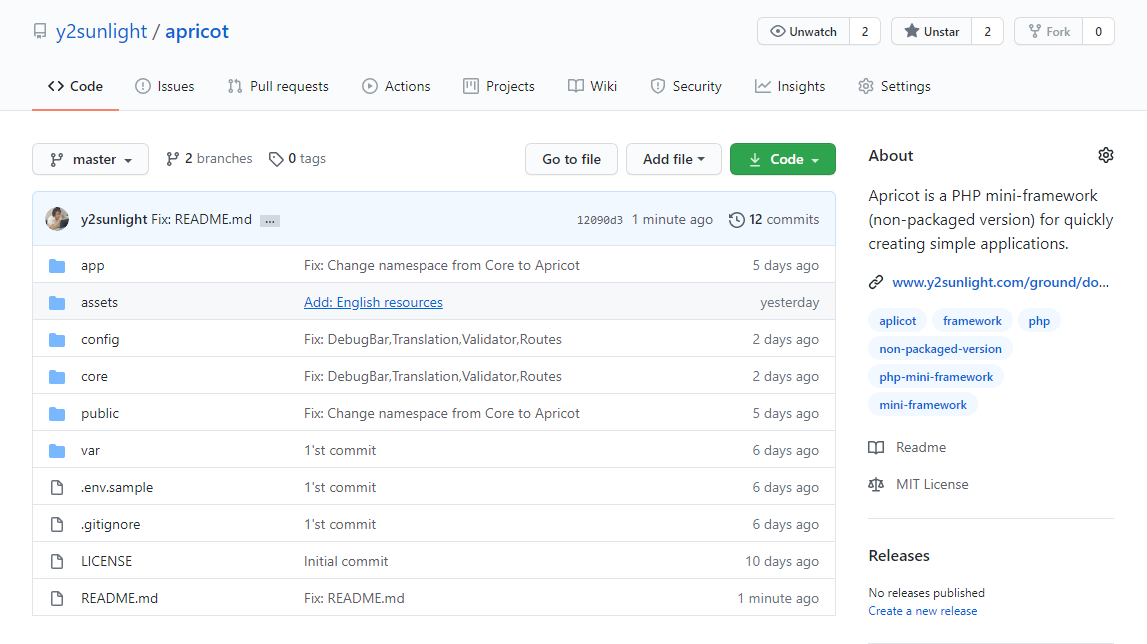Apricot本体のリファクタリング作業は、最初に本番リリースするまでは master ブランチで行い、REAMME.mdファイルとLICENSEファイルの編集作業は、別のreadme-editsブランチで行います。