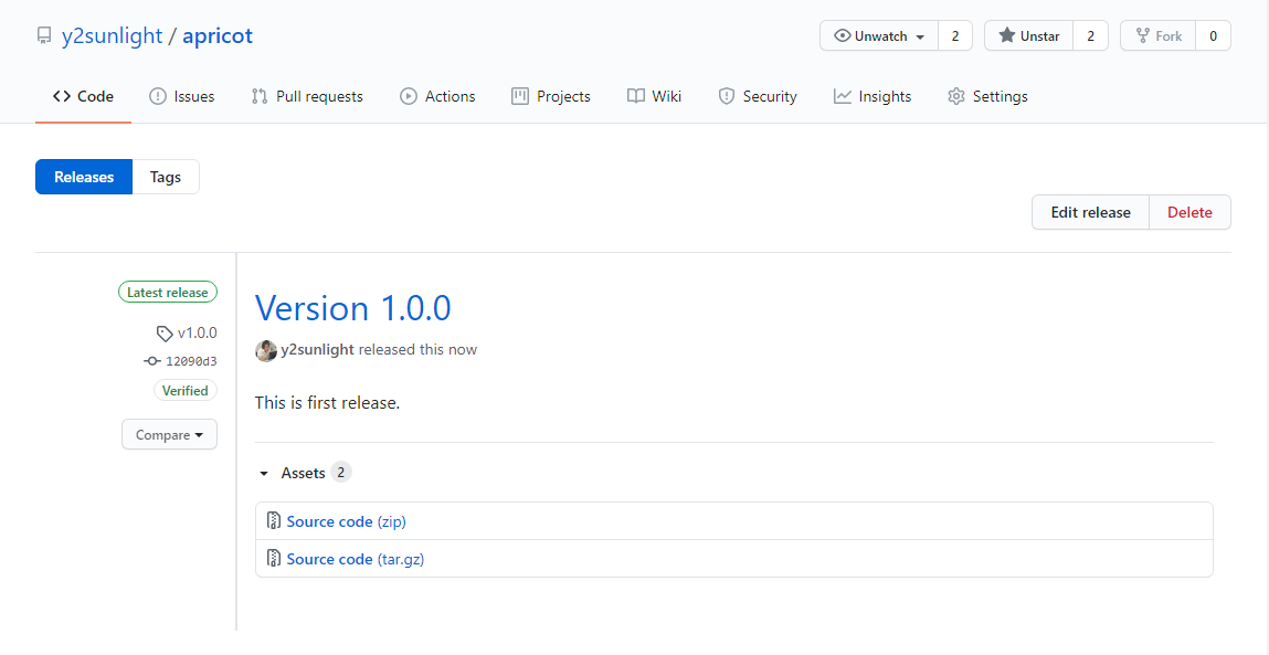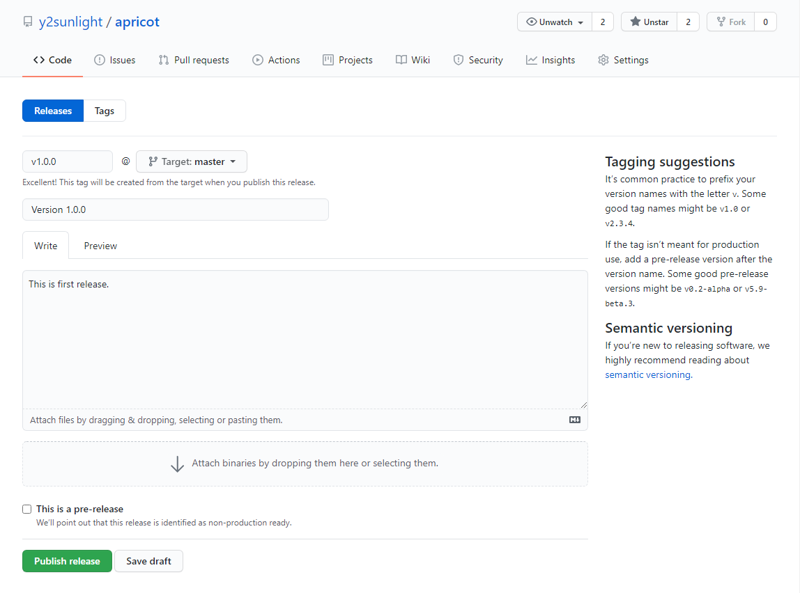 初版のソースコードの準備が終了したら、GitHubでそのリポジトリに対してリリースを作成します。