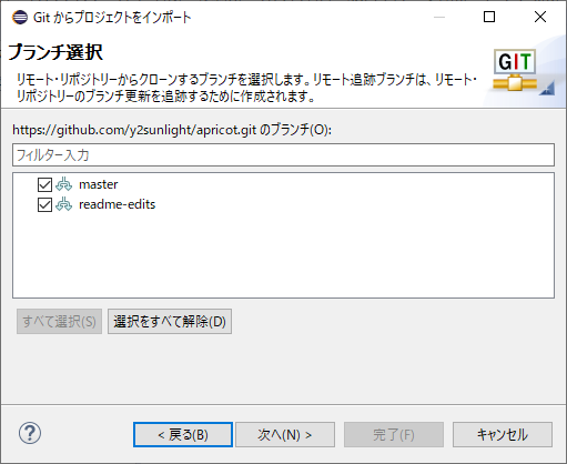 GitHubのリモートリポジトリ( apricot ) の master ブランチをインポートして Eclipseで編集できるようにします。操作方法については概略のみ説明します。詳細は、本編の「GitHub Eclipseによるリポジトリの基本操作」を参照して下さい。