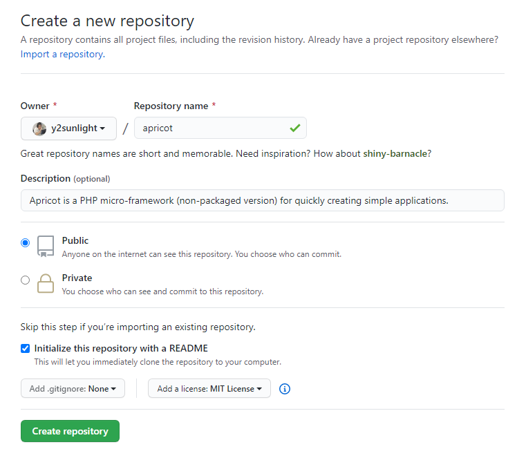 apricot ) を入力します。.gitignore — 本章では .gitignore を独自で作成すので None を選択します。License — apricotは MIT License で公開するします。■ [Create]ボタンを押して下さい。