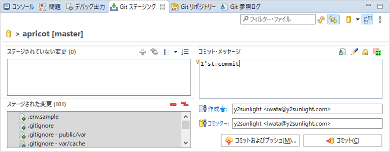 ■ 無視ファイル以外の全てのファイルをステージして、[コミット]します。