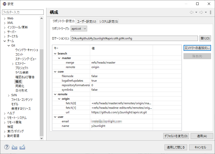 Eclipse で apricot リポジトリの設定画面を開きます: