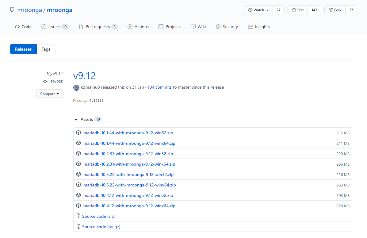 本編で対象としている XAMPP7.3 に同封されている MariaDB 10.4.11 と同じマイナーバージョンを持つ MariaDB-with-Mroonga をダウンロードします。ここでは、MariaDB 10.4.12(with Mroonga9.12) の Windowsバイナリを以下のサイトから入手します。