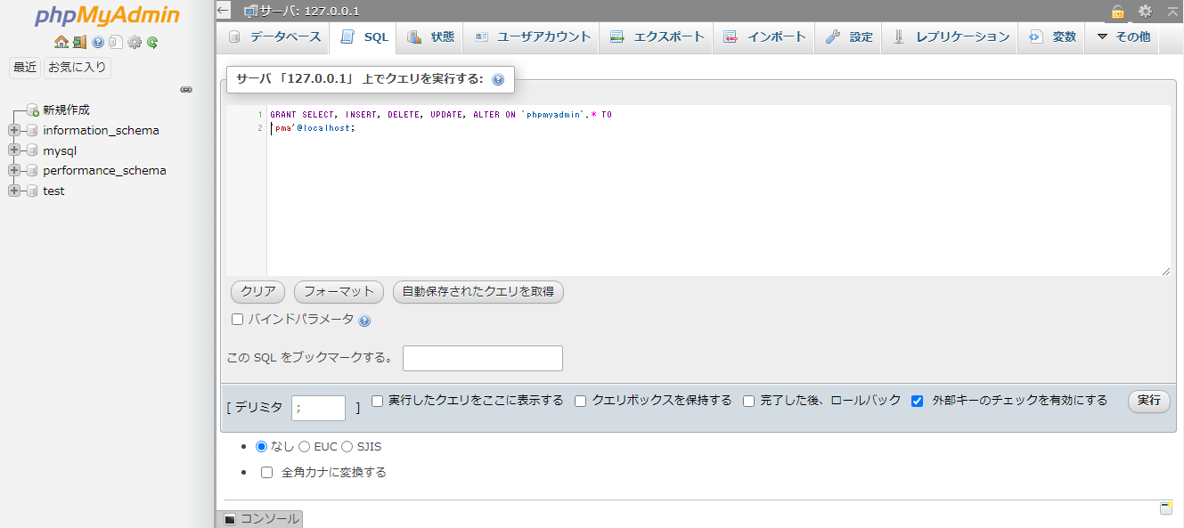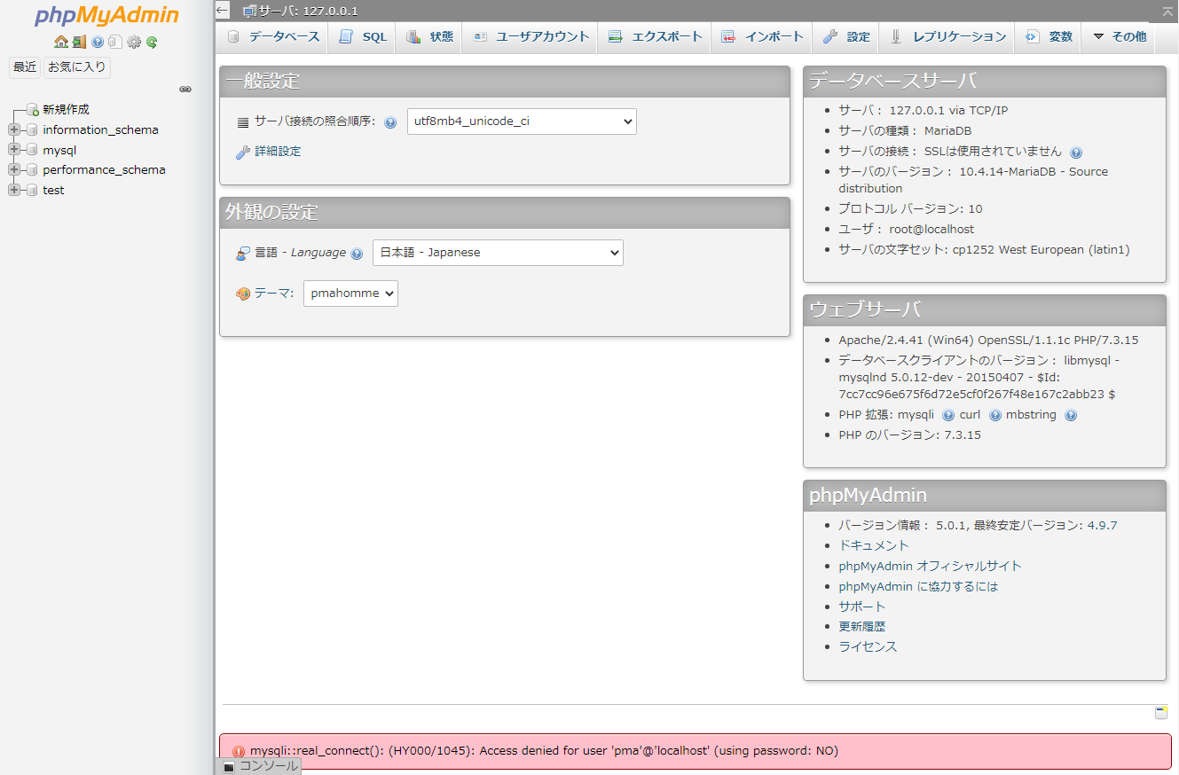 (!) mysqli::real_connect(): (HY000/1045): Access denied for user 'pma'@'localhost' (using password: NO) (!) 設定ファイルに定義されている管理ユーザ(controluser)での接続に失敗しました。