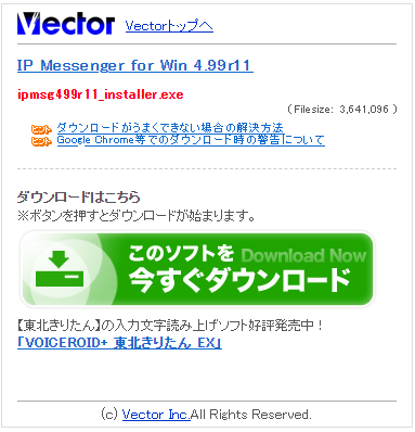 ■ [このソフトを今すぐダウンロード]をクリックし、ipmsg499r11_installer.exe をダウンロードします。