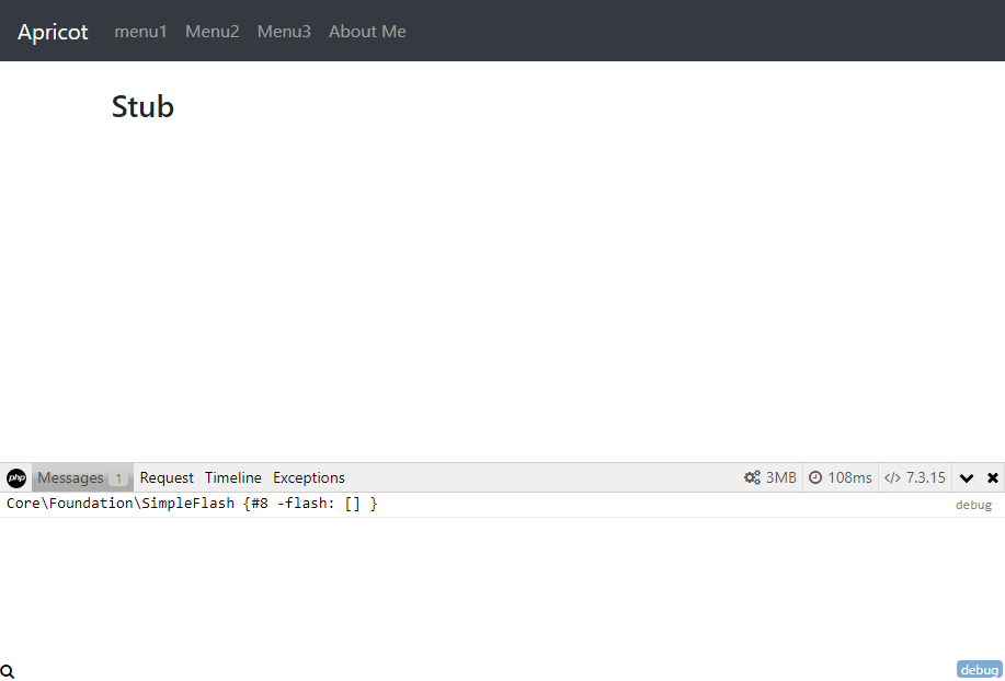 テスト実行ここまでの実装で一度実行してみましょう。ブラウザ上で以下のURLにアクセスしてみて下さい。 http://localhost/ws2019/apricot/public/ 次の画面が表示されます  ■ [menu1],[menu2],[menu3]を押すとそれぞれのスタブ画面が表示されます。