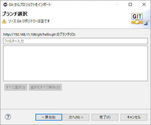 リポジトリはまだ空なので「ソース Gitリポジトリは空です」のメッセージが出ますが問題ありません。リポジトリが空でない場合は、ここでブランチを選択します。
