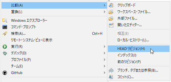 「HEADリビジョン」は、比較、置換や復元操作でよく使用される表現です。例えば、プロジェクトエクスプローラーでファイルを右クリックして[比較]を選択すると以下のメニューが表示されます。