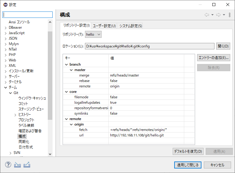 git configで設定可能で、EGitでは初期設定で説明したGitの設定画面の [リポジトリ設定] から確認または変更できます。