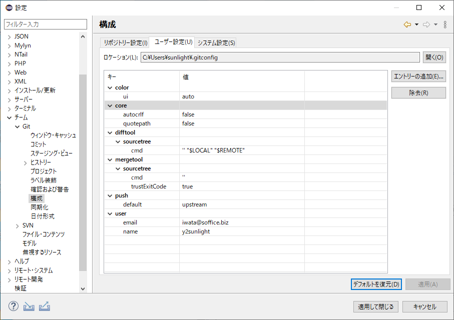 このユーザ設定は Git for Windows が参照しているユーザ設定ファイル(C:\Users\sunlight\.gitconfig)と同じものに保存されます。また、他の設定(リポジトリー設定、システム設定)も Git for Windows と同じファイルに保存されている点に注意して下さい。