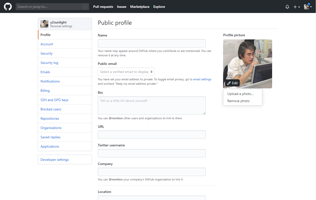 ■ 左側の[Profile picture]の[Edit]ボタンを押し、[Upload a photo…]を選択して下さい。