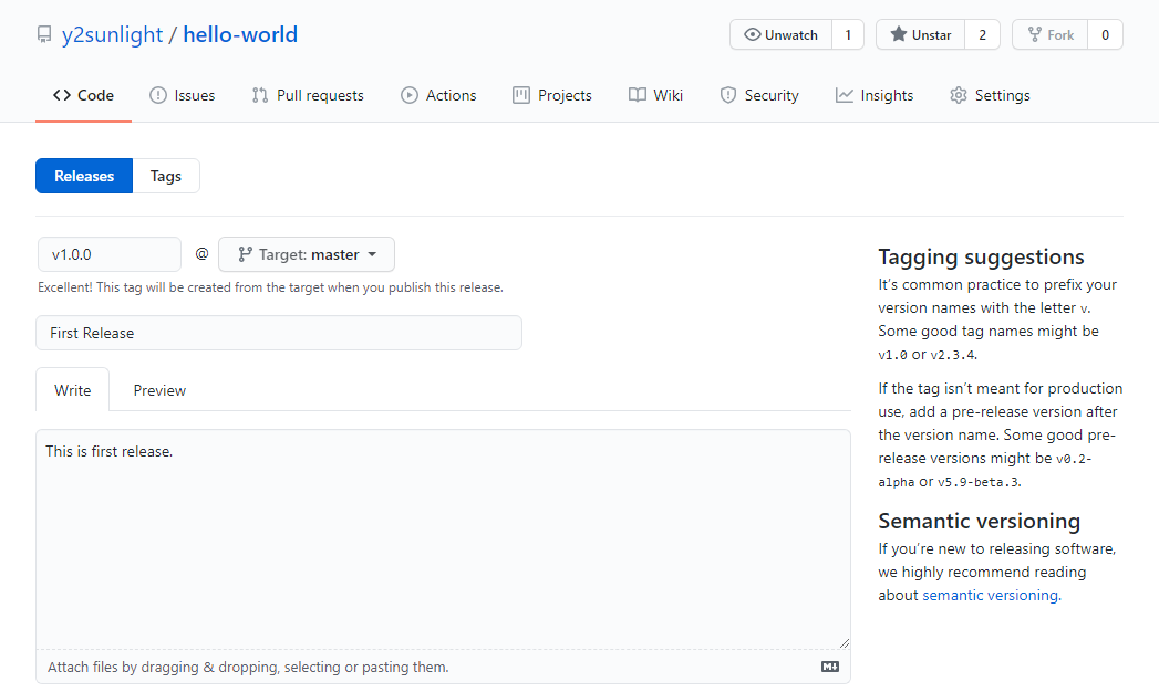リリースリリースの作成リポジトリ hello-world に移動します。まだ表示していない場合は、ダッシュボードの左サイドバーから hello-world を選択して下さい。  ■ 右サイドの [Releases] 下の [Create a new release] をクリックします。  ■ [Tag version]を入力します( ここでは先に作成してプッシュした v1.0.0)。ここで新しいTag versionを入力すると、新しいタグが生成されます。リリース用のタグは、筆者的には、GitクライアントではなくGitHub(この画面)で作成する方が良いように思います。本章では、Eclipseでの操作も紹介する為に、Eclipseでタグを作成しています。■ [Release title]を入力します。