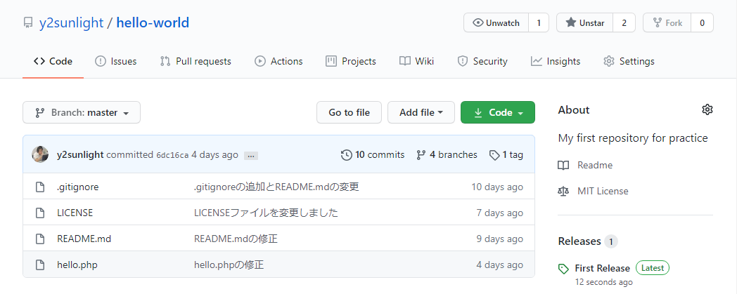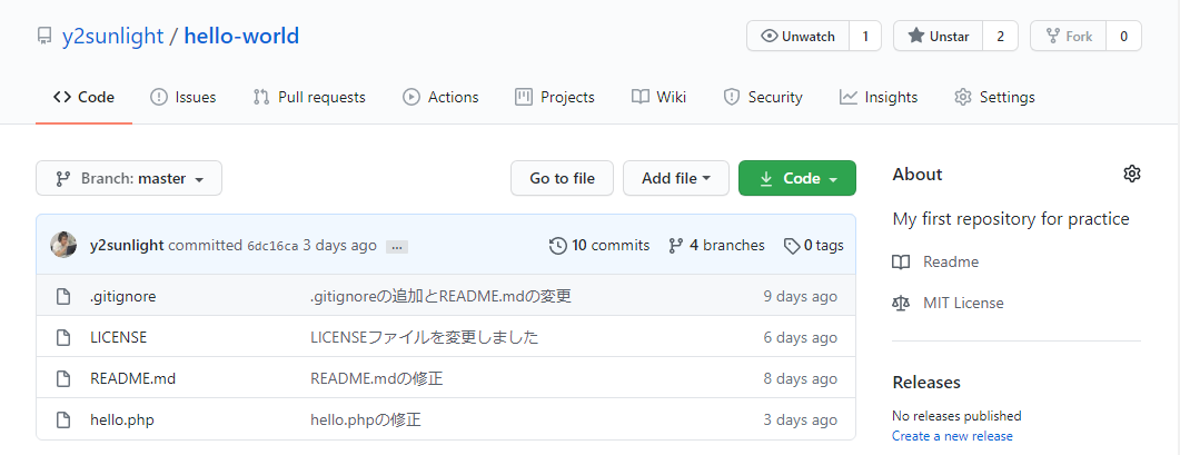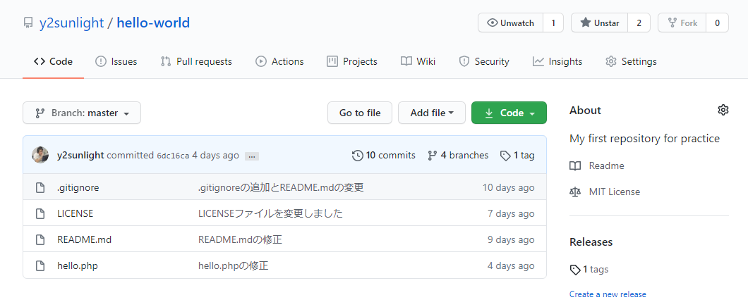 リリースの編集リポジトリ hello-world のメインページに移動します。  ■ 右サイドの[Releases]をクリックします。  ■ リリースの一覧が表示されます。
