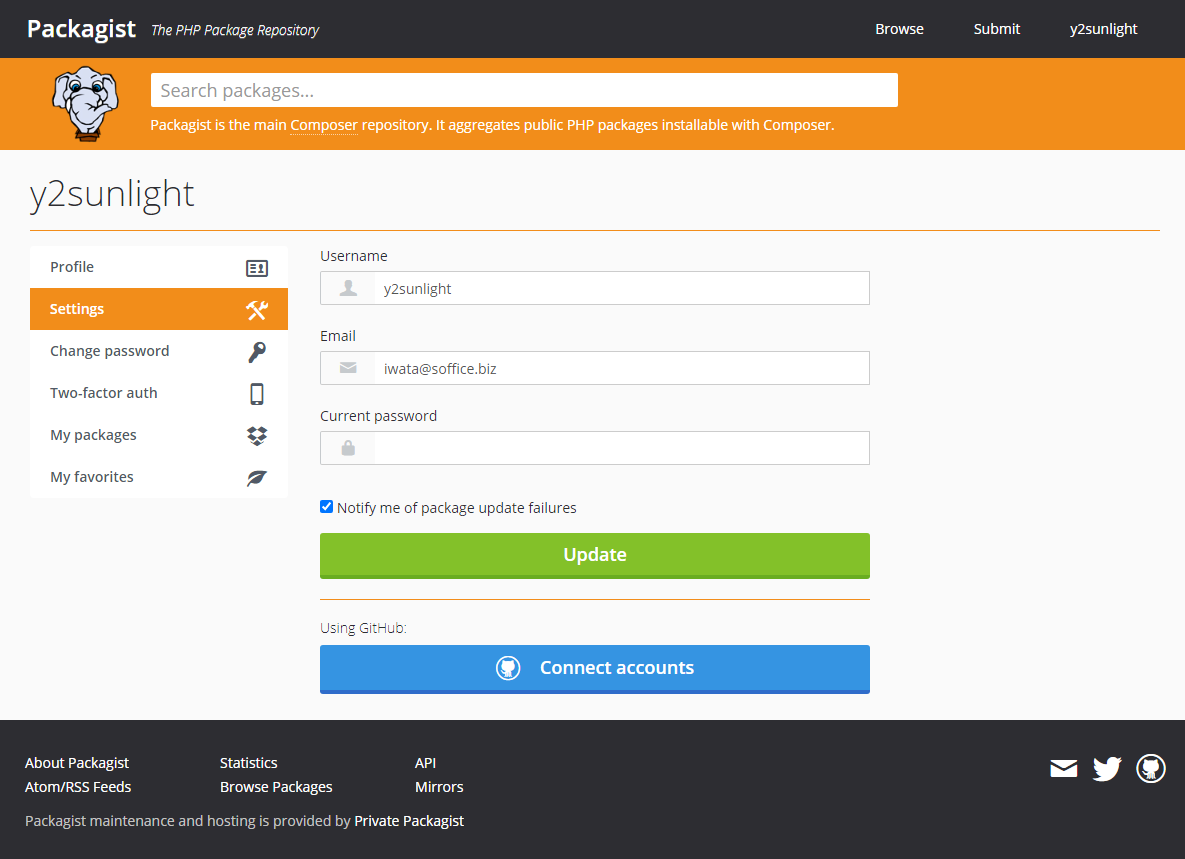 ここで、Packagistで登録しているメールアドレスをGravatarにも登録して、そのメールにアバター画像を紐付けすれば、Packagistの プロフィールのアバターが変更できます。