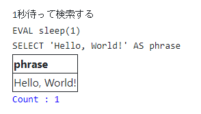 #1秒待って検索する; EVAL sleep(1); SELECT 'Hello, World!' AS phrase;