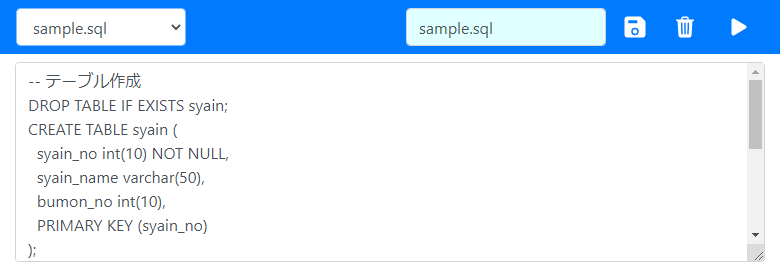 SQLスクリプトの保存と削除は画面右上のファイル名ボックス、保存ボタン、削除ボタンで行います。