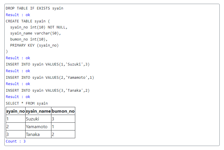 画面右上のプレイボタン(3つ並んだ三番目のボタン)を押すと、編集済のSQLスクリプトを実行し、その結果を表示します。