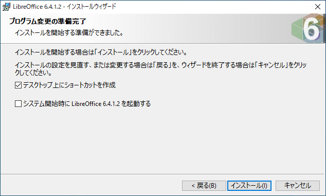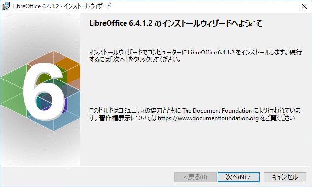 ダウンロードしたファイル( LibreOffice_6.4.1_Win_x64.msi )を実行します。