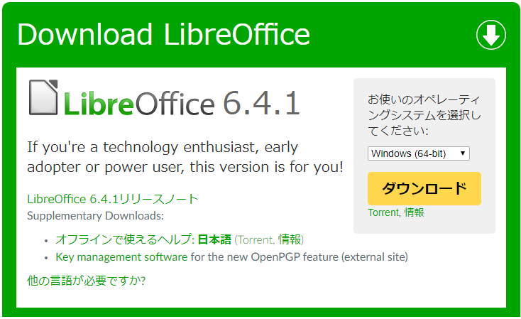 LibreOfficeのサイト( https://ja.libreoffice.org/ )にアクセスします。